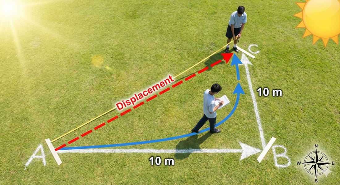 - Distinguish between distance and displacement in different situations and apply concepts to solve real-world problems.