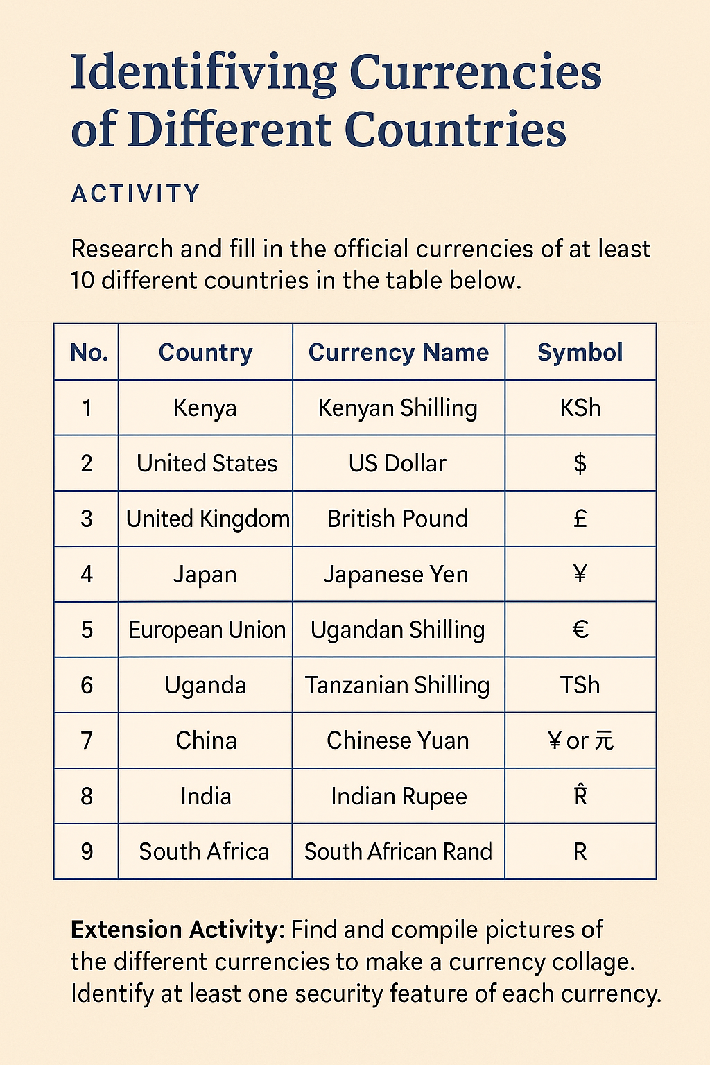 Objective: By the end of this activity, you will be able to identify the official currency of various countries, understand their symbols, and recognize their significance in global trade and economics.
